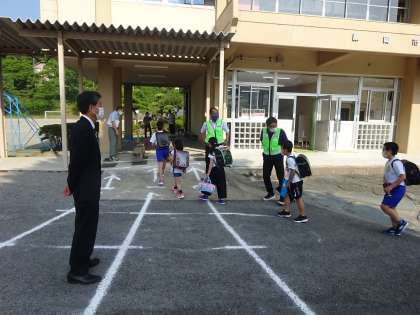 学校が再開して5日目になりました。鬼石小では、朝7:40過ぎには、子どもたちが距離を保ちつつ、全員が落ち着いて登校してきました。校門で出迎えてくれた地域の方や教育長、校長先生を見つけると、笑顔で挨拶している子どもたちの姿が印象的でした。