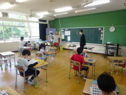 朝から日差しが強かったですが、玄関入り口にはミストが設置されていたり、校舎の軒先で子どもたちの健康確認を行ったりするなど、暑さ対策も万全でした。また、トイレのドアに抗ウイルスが見込まれる銅繊維シートを設置したり、子どもたちがソーシャルディスタンスを意識して保健室が利用できるように掲示物を工夫したりと、子どもたちの安全安心を第一に考えた工夫が随所に見られました。