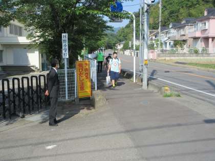 今朝は、日野小学校に訪問しました。徒歩で通学してくる子どもたちは、前後を適度に空けソーシャルディスタンスを保ちながらも、教育長や校長先生、交通指導員さんの姿を見つけると、「おはようございます」と元気にあいさつをしました。バス通学の子どもたちは、先生方にあいさつし、玄関前で適度に間隔をとりながら並んで、養護の先生に健康状態を報告しました。その後、手指消毒を行って教室に向かいました。校舎内は、消毒液はもちろん、三密にならないよう様々な掲示があり、子どもたちの安心安全を守る工夫がたくさんなされていました。