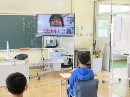 教室では、短学活のあと、オンラインシステムで校長室と各教室をつなぎ、朝礼が行われました。校長先生から日野小で見つけた8つの「あたたかいこころ」のお話があり、子どもたちは教室からテレビを通して校長先生のメッセージを聞き、ほっこりとあたたかい気持ちで1時間目の授業に臨みました。