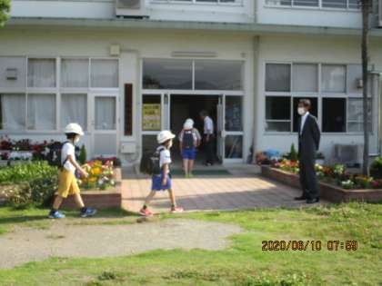 児童は、登校のルールを守りながら元気に登校しており、玄関前では教育長や先生方にしっかり挨拶ができていました。