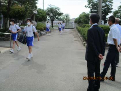 全員登校2日目です。1日(月)から始めた登校見守りですが、昨日までに全小学校を見させてもらい、今日からは中学校の様子を見させてもらいます。中学校初日は、東中学校の登校の様子を見させてもらいました。