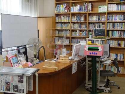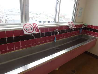 また、図書室のカウンターに飛沫防止ボードが設置されていたり、水道の蛇口にはソーシャルディスタンスを意識できるような掲示物が貼られていたりと、「新しい生活様式」を意識しながら学校生活が送れるよう様々な工夫が見られました。先生方の工夫に支えられ、子どもの安心安全が確保されていることに感謝します。