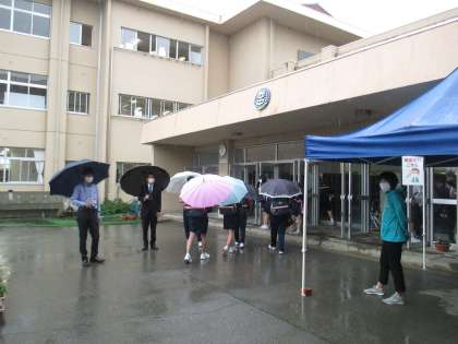 朝から雨が降り続いていましたが、西中学校では、玄関での見守りの先生方と生徒たちがマスク越しで挨拶を交わして、元気な表情で玄関に入っていきました。特に雨の中の自転車登校は、大変だったと思います。生徒たちが校舎内で頭髪や服に付いた雨水を拭き取っている様子を見て、風邪など引かないよう願わずにはいられませんでした。