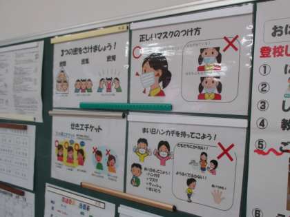先生方も、教室内の換気や学習の場づくりを工夫して3密を回避したり、放課後にトイレ等の清掃や消毒を行ったりするなど、感染症予防対策を継続して行っています。これまでの生活よりも制限のあるコロナ禍での学校生活ですが、必要な予防対策を行いながら、児童生徒、教職員が一丸となって学習に取り組んでいる様子が伺えました。