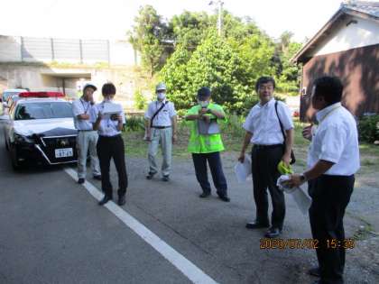 梅雨の合間の晴天の中、藤岡警察署、藤岡土木事務所、藤岡市土木課、藤岡市地域安全課、西中校区の小中学校の教頭先生にお世話になり、計13名で西中校区の通学路安全点検を行いました。例年夏休みに行っている通学路点検ですが、本年度は子どもたちがより安全に通学できるよう1ヶ月早く実施しました。