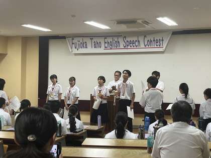 全部で32名の生徒たちが自分のことや日頃感じたり考えたりしていることを英語で発表しました。内容については、1年生は自分自身や家族のこと、2、3年生は、友達との関わり、生き方や考え方、世界の多様性、AIとの共存等、広い視野から中学生らしい考えや思いをスピーチしていました。各校の代表者というだけあり、瑞々しい感性と素晴らしい英語の発音で発表をしていました。話す人の思いが、聞く人の心に響く、素晴らしいスピーチコンテストとなりました。