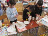 1月21日(水)、1年生は図工「スルスル ビューン」で、張ったロープをすべるおもちゃを作りました。 グループで話し合いながら、形や飾りを工夫していました。
