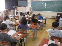 6年生は算数で、比例と反比例の学習のまとめとして、たしかめ問題に取り組んでいます。できた順に先生から細かく指導されていました。