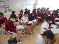 1年生は、「あいうえお」の歌に合わせて音読していました。あ あかるい あさひだ あいうえおい いいこと いろいろ あいうえおう うたごえ うきうき あいうえおお おいしい おにぎり あいうえおうきうき...