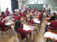 1年生は算数の学習で、教科書の動物が教室の机に座っている絵を見ながら、その動物が何番目になるかを考えました。前から、後ろから、右から、左からと、さまざまな見方があることに気づき、友達と「こっちからだと...